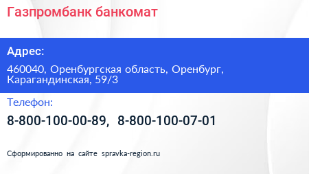 Газпромбанк, банкомат по адресу 460040, Оренбургская область, Оренбург, Карагандинская, 59/3 в дальнейшем Организация, размещена в следующих категориях: