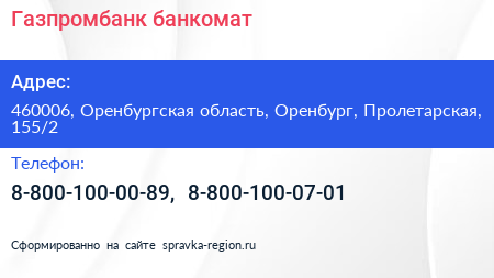 Газпромбанк, банкомат по адресу 460006, Оренбургская область, Оренбург, Пролетарская, 155/2 в дальнейшем Организация, размещена в следующих категориях: