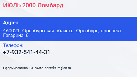ИЮЛЬ-2000 (Ломбард) по адресу 460021, Оренбургская область, Оренбург, проспект Гагарина, 8 в дальнейшем Организация, размещена в следующих категориях: