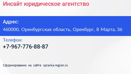 Инсайт, юридическое агентство по адресу 460000, Оренбургская область, Оренбург, 8 Марта, 36 в дальнейшем Организация, размещена в следующих категориях: