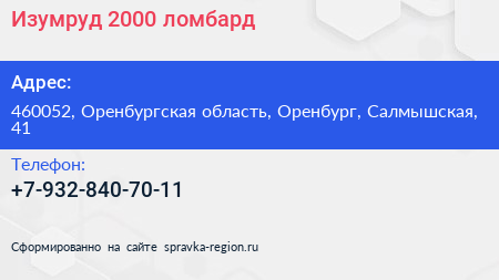 Изумруд-2000, ломбард по адресу 460052, Оренбургская область, Оренбург, Салмышская, 41 в дальнейшем Организация, размещена в следующих категориях: