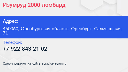 Изумруд-2000, ломбард по адресу 460060, Оренбургская область, Оренбург, Салмышская, 71 в дальнейшем Организация, размещена в следующих категориях: