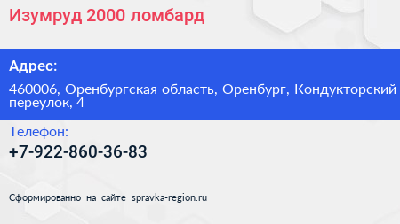 Изумруд-2000, ломбард по адресу 460006, Оренбургская область, Оренбург, Кондукторский переулок, 4 в дальнейшем Организация, размещена в следующих категориях: