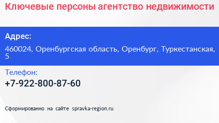 Ключевые персоны, агентство недвижимости по адресу 460024, Оренбургская область, Оренбург, Туркестанская, 5 в дальнейшем Организация, размещена в следующих категориях: