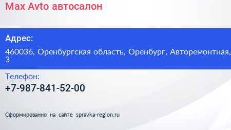 Max Avto, автосалон по адресу 460036, Оренбургская область, Оренбург, Авторемонтная, 3 в дальнейшем Организация, размещена в следующих категориях: