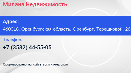 Милана Недвижимость по адресу 460018, Оренбургская область, Оренбург, Терешковой, 26 в дальнейшем Организация, размещена в следующих категориях: