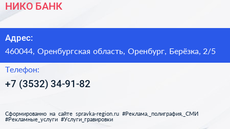 НИКО-БАНК по адресу 460044, Оренбургская область, Оренбург, Берёзка, 2/5 в дальнейшем Организация, размещена в следующих категориях: