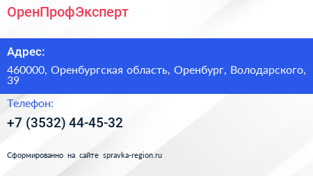 ОренПрофЭксперт по адресу 460000, Оренбургская область, Оренбург, Володарского, 39 в дальнейшем Организация, размещена в следующих категориях:
