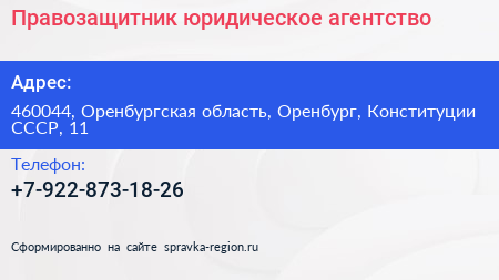 Правозащитник, юридическое агентство по адресу 460044, Оренбургская область, Оренбург, Конституции СССР, 11 в дальнейшем Организация, размещена в следующих категориях: