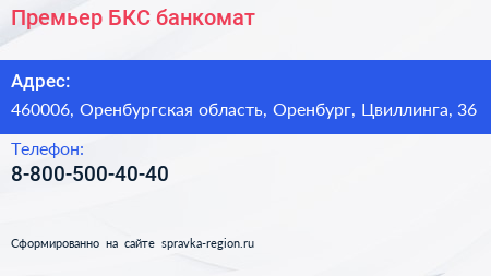 Премьер БКС, банкомат по адресу 460006, Оренбургская область, Оренбург, Цвиллинга, 36 в дальнейшем Организация, размещена в следующих категориях: