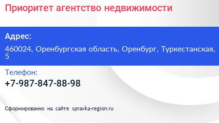 Приоритет, агентство недвижимости по адресу 460024, Оренбургская область, Оренбург, Туркестанская, 5 в дальнейшем Организация, размещена в следующих категориях: