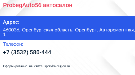 ProbegAuto56, автосалон по адресу 460036, Оренбургская область, Оренбург, Авторемонтная, 1 в дальнейшем Организация, размещена в следующих категориях: