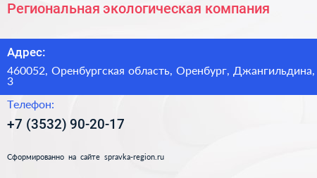 Региональная экологическая компания по адресу 460052, Оренбургская область, Оренбург, Джангильдина, 3 в дальнейшем Организация, размещена в следующих категориях: