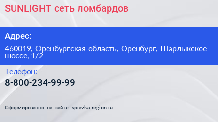 SUNLIGHT, сеть ломбардов по адресу 460019, Оренбургская область, Оренбург, Шарлыкское шоссе, 1/2 в дальнейшем Организация, размещена в следующих категориях: