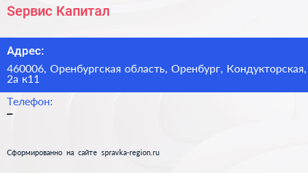 Sервис Капитал по адресу 460006, Оренбургская область, Оренбург, Кондукторская, 2а к11 в дальнейшем Организация, размещена в следующих категориях: