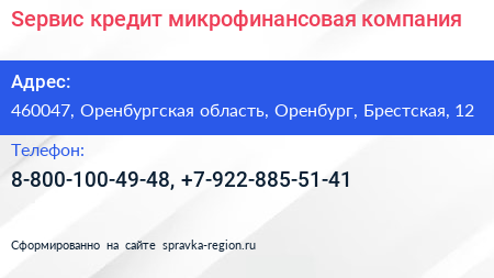Sервис кредит, микрофинансовая компания по адресу 460047, Оренбургская область, Оренбург, Брестская, 12 в дальнейшем Организация, размещена в следующих категориях: