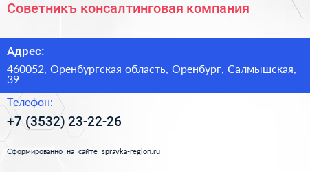 Советникъ, консалтинговая компания по адресу 460052, Оренбургская область, Оренбург, Салмышская, 39 в дальнейшем Организация, размещена в следующих категориях: