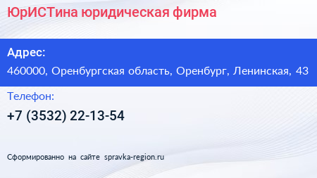 ЮрИСТина, юридическая фирма по адресу 460000, Оренбургская область, Оренбург, Ленинская, 43 в дальнейшем Организация, размещена в следующих категориях:
