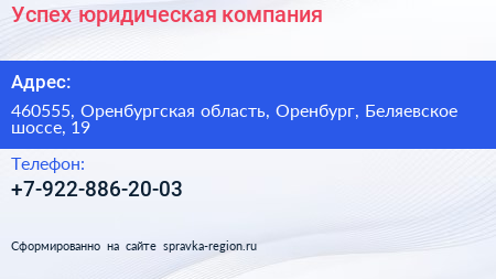 Успех, юридическая компания по адресу 460555, Оренбургская область, Оренбург, Беляевское шоссе, 19 в дальнейшем Организация, размещена в следующих категориях: