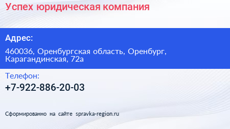 Успех, юридическая компания по адресу 460036, Оренбургская область, Оренбург, Карагандинская, 72а в дальнейшем Организация, размещена в следующих категориях: