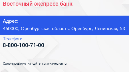 Восточный экспресс банк по адресу 460000, Оренбургская область, Оренбург, Ленинская, 53 в дальнейшем Организация, размещена в следующих категориях: