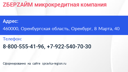 ZБЕРZАЙМ, микрокредитная компания по адресу 460000, Оренбургская область, Оренбург, 8 Марта, 40 в дальнейшем Организация, размещена в следующих категориях: