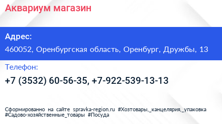 Аквариум, магазин по адресу 460052, Оренбургская область, Оренбург, Дружбы, 13 в дальнейшем Организация, размещена в следующих категориях: