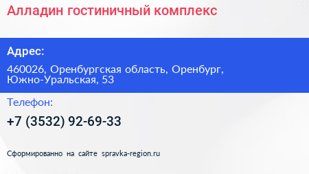 Алладин, гостиничный комплекс по адресу 460026, Оренбургская область, Оренбург, Южно-Уральская, 53 в дальнейшем Организация, размещена в следующих категориях: