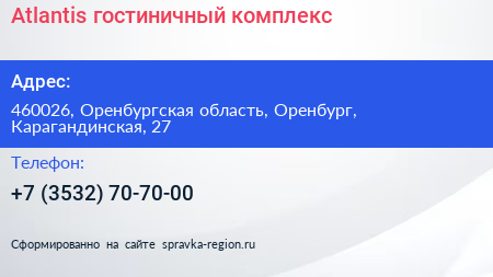 Atlantis, гостиничный комплекс по адресу 460026, Оренбургская область, Оренбург, Карагандинская, 27 в дальнейшем Организация, размещена в следующих категориях: