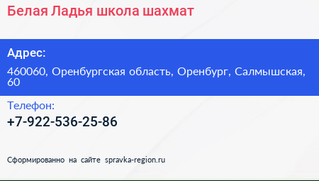 Белая Ладья, школа шахмат по адресу 460060, Оренбургская область, Оренбург, Салмышская, 60 в дальнейшем Организация, размещена в следующих категориях: