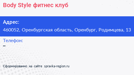 Body Style, фитнес-клуб по адресу 460052, Оренбургская область, Оренбург, Родимцева, 13 в дальнейшем Организация, размещена в следующих категориях: