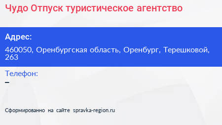 Чудо-Отпуск, туристическое агентство по адресу 460050, Оренбургская область, Оренбург, Терешковой, 263 в дальнейшем Организация, размещена в следующих категориях: