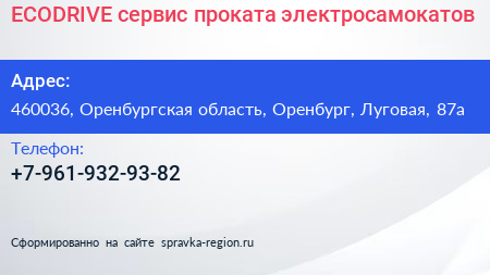 ECODRIVE, сервис проката электросамокатов по адресу 460036, Оренбургская область, Оренбург, Луговая, 87а в дальнейшем Организация, размещена в следующих категориях: