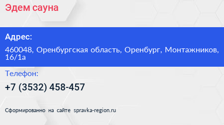 Эдем, сауна по адресу 460048, Оренбургская область, Оренбург, Монтажников, 16/1а в дальнейшем Организация, размещена в следующих категориях:
