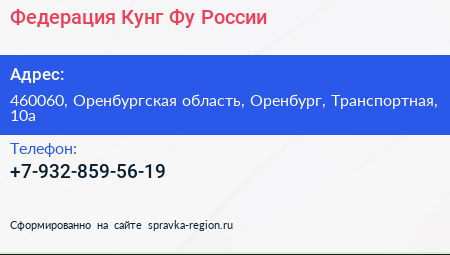 Федерация Кунг-Фу России по адресу 460060, Оренбургская область, Оренбург, Транспортная, 10а в дальнейшем Организация, размещена в следующих категориях: