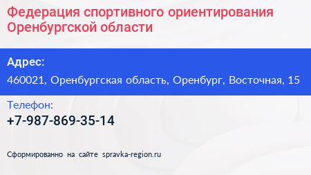 Федерация спортивного ориентирования Оренбургской области по адресу 460021, Оренбургская область, Оренбург, Восточная, 15 в дальнейшем Организация, размещена в следующих категориях: