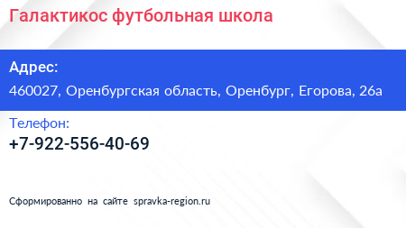 Галактикос, футбольная школа по адресу 460027, Оренбургская область, Оренбург, Егорова, 26а в дальнейшем Организация, размещена в следующих категориях: