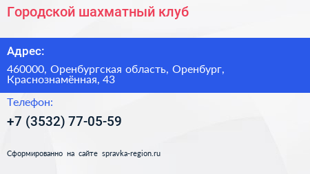 Городской шахматный клуб по адресу 460000, Оренбургская область, Оренбург, Краснознамённая, 43 в дальнейшем Организация, размещена в следующих категориях: