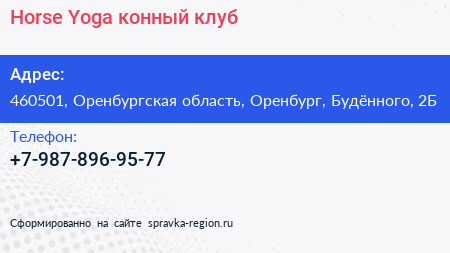 Horse Yoga, конный клуб по адресу 460501, Оренбургская область, Оренбург, Будённого, 2Б в дальнейшем Организация, размещена в следующих категориях: