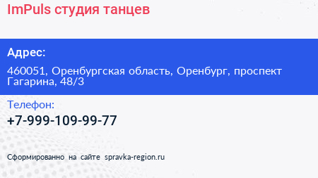 ImPuls, студия танцев по адресу 460051, Оренбургская область, Оренбург, проспект Гагарина, 48/3 в дальнейшем Организация, размещена в следующих категориях:
