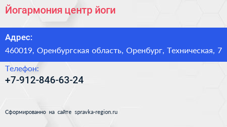Йогармония, центр йоги по адресу 460019, Оренбургская область, Оренбург, Техническая, 7 в дальнейшем Организация, размещена в следующих категориях: