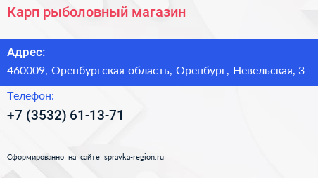 Карп, рыболовный магазин по адресу 460009, Оренбургская область, Оренбург, Невельская, 3 в дальнейшем Организация, размещена в следующих категориях: