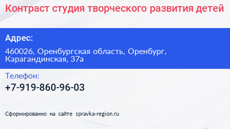 Контраст, студия творческого развития детей по адресу 460026, Оренбургская область, Оренбург, Карагандинская, 37а в дальнейшем Организация, размещена в следующих категориях: