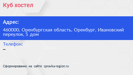 Куб, хостел по адресу 460000, Оренбургская область, Оренбург, Ивановский переулок, 5 дом в дальнейшем Организация, размещена в следующих категориях: