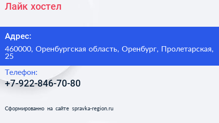 Лайк, хостел по адресу 460000, Оренбургская область, Оренбург, Пролетарская, 25 в дальнейшем Организация, размещена в следующих категориях: