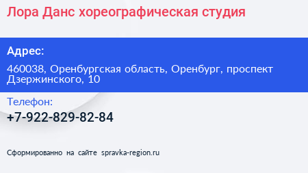 Лора-Данс, хореографическая студия по адресу 460038, Оренбургская область, Оренбург, проспект Дзержинского, 10 в дальнейшем Организация, размещена в следующих категориях: