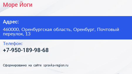 Море Йоги по адресу 460000, Оренбургская область, Оренбург, Почтовый переулок, 13 в дальнейшем Организация, размещена в следующих категориях: