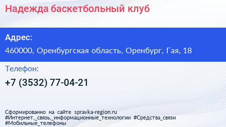 Надежда, баскетбольный клуб по адресу 460000, Оренбургская область, Оренбург, Гая, 18 в дальнейшем Организация, размещена в следующих категориях: