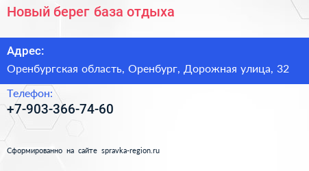 Новый берег, база отдыха по адресу Оренбургская область, Оренбург, Дорожная улица, 32 в дальнейшем Организация, размещена в следующих категориях: