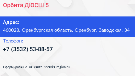 Орбита, ДЮСШ №5 по адресу 460028, Оренбургская область, Оренбург, Заводская, 34 в дальнейшем Организация, размещена в следующих категориях: